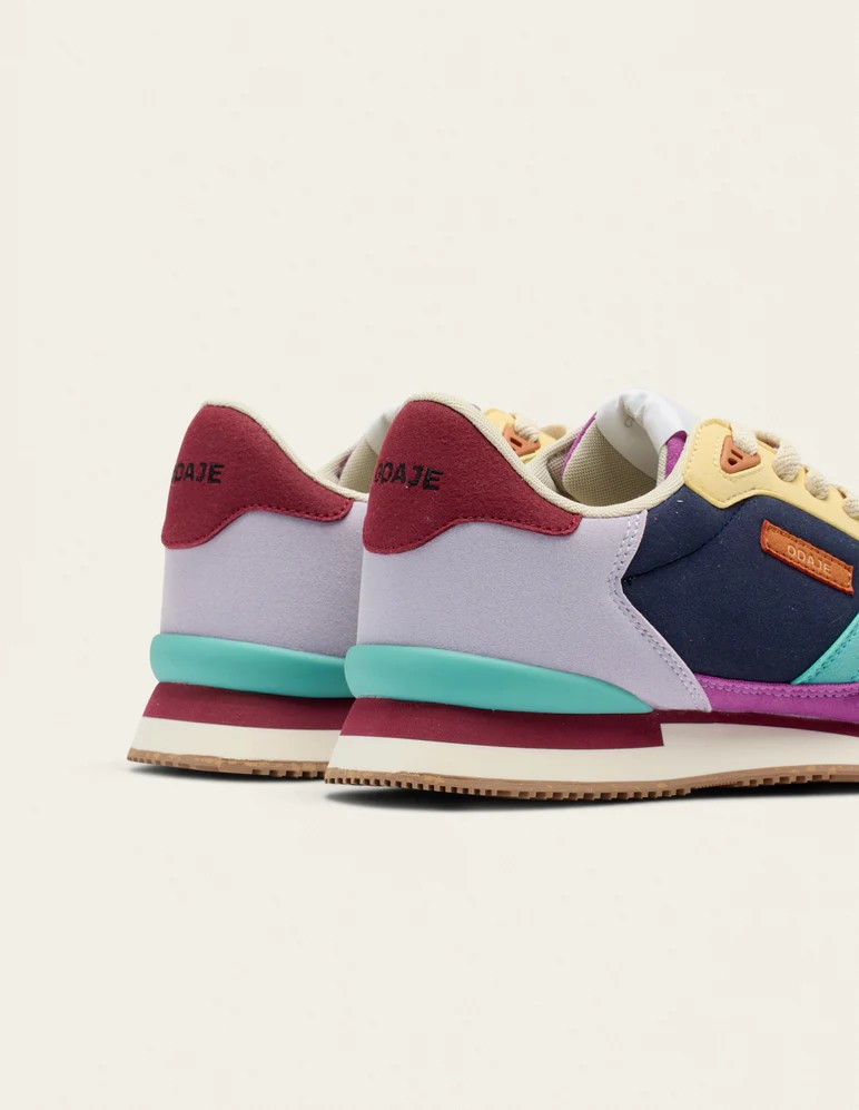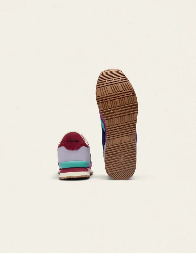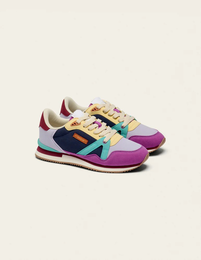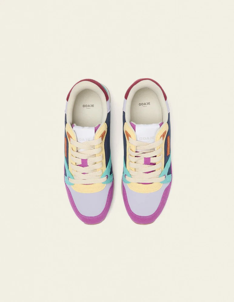 Découvrez Andrée, en violet, lilas et jaune, notre basket iconique pour femme. Éco-conçue pour minimiser son impact carbone, elle est fabriquée à partir de suède vegan. Sa semelle extérieure est en EVA avec un patin en gomme recyclée et ses lacets sont en polyester recyclé. Sa doublure et sa semelle intérieure sont en mesh recyclé. Entièrement vegan, Andrée allie design vintage et éco-responsabilité. Coupure, piqûre et montage réalisés en Chine.