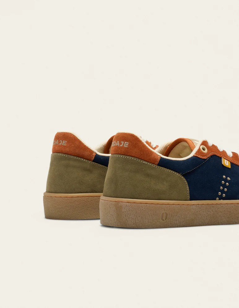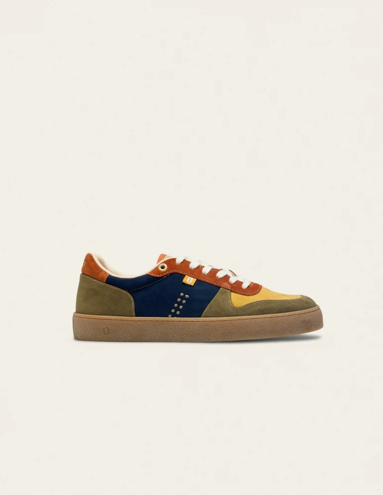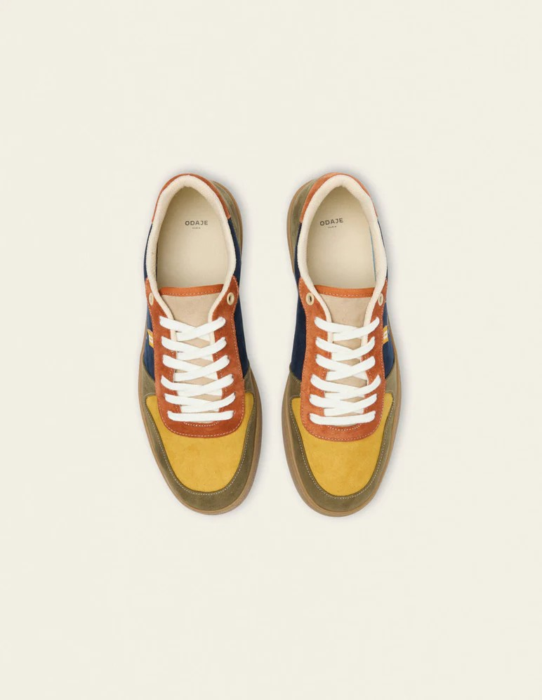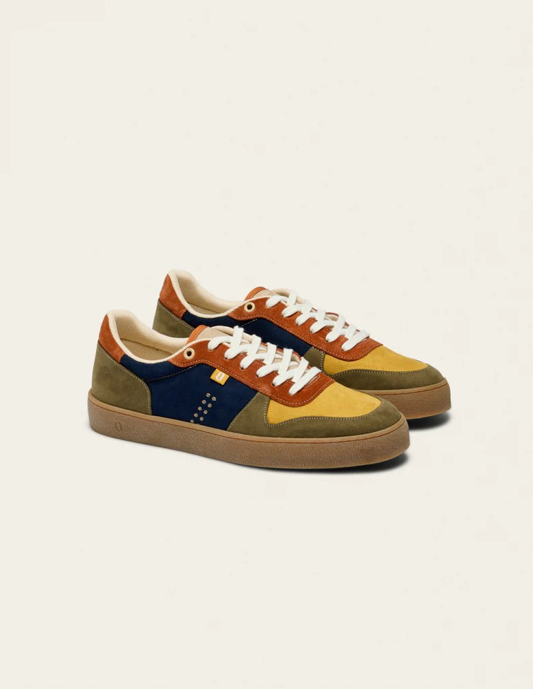 Basket basse Arthur en kaki, moutarde et brique, un intemporel du vestiaire masculin. Dessinée dans notre atelier parisien et fabriquée au Portugal, elle est conçue à partir de suède recyclé sourcé en Espagne et Portugal. Elle est confectionnée avec notre semelle (re)colte, fabriquée à partir du recyclage de chaussures usagées collectées dans nos boutiques et de caoutchouc recyclé. Arthur est montée avec un cousu Strobel pour plus de souplesse. Coupure, piqûre et montage réalisés au Portugal.