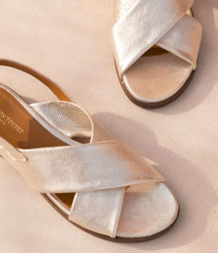 Ses brides croisées à l’avant en cuir pailleté apportent lumière et élégance.