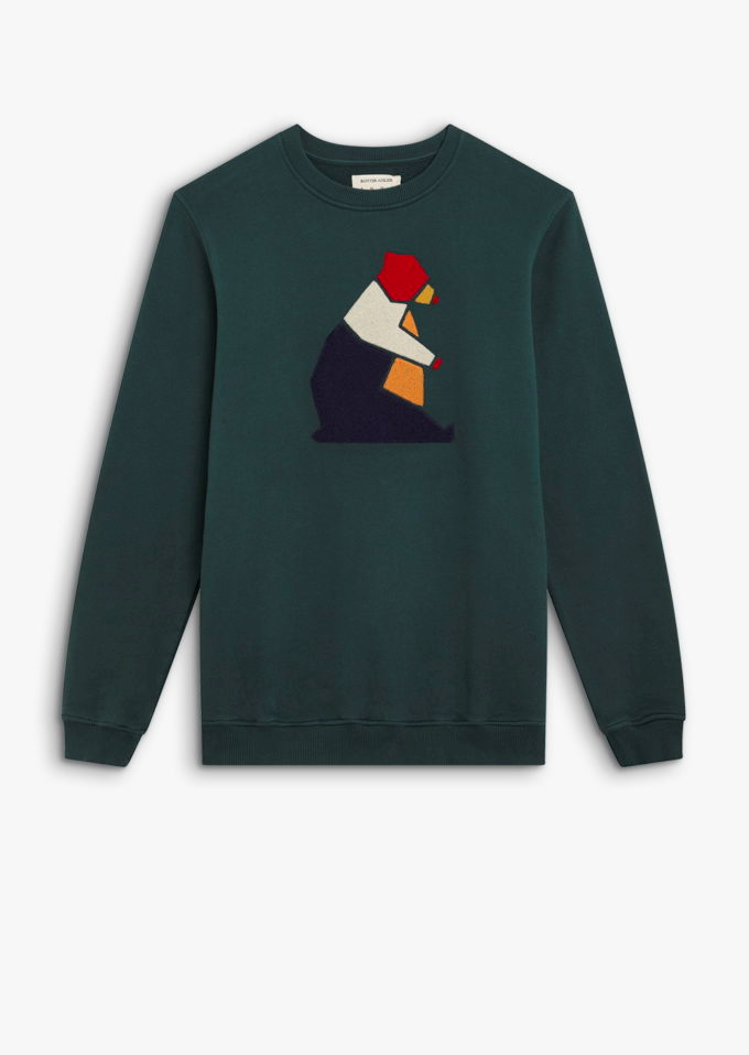 Encolure arrondie, bord côte col, hanche et poignets, motif « OURS » coloré brodé en relief.