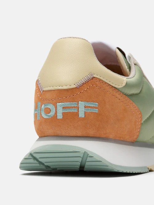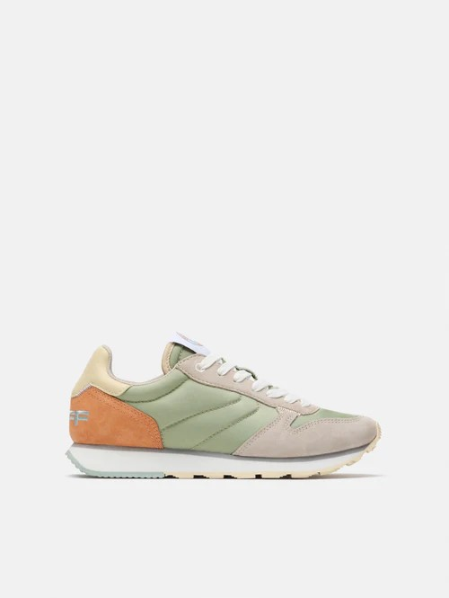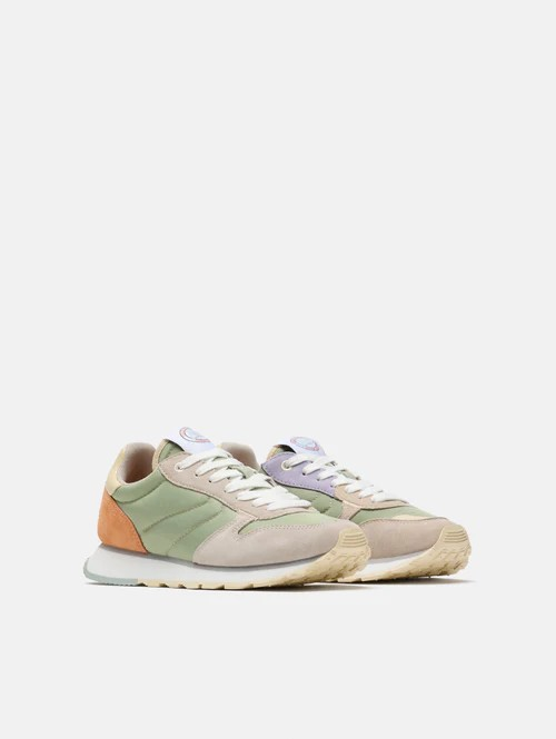 Pour les amoureux du style rétro et vintage, les DELPHI en nylon vert d'eau avec des détails asymétriques en daim lilas et orange sont le mélange parfait pour se démarquer partout. Le daim gris souris sur le devant et le cuir jaune pastel ajoutent une touche haut de gamme. La semelle gaufrée en aigue-marine et jaune tendre, ainsi que le logo de la marque, sont la cerise sur le gâteau. Légère et confortable grâce à la semelle intérieure en mousse à mémoire de forme. Parfaites pour être associées à un jean classique et à votre T-shirt préféré.