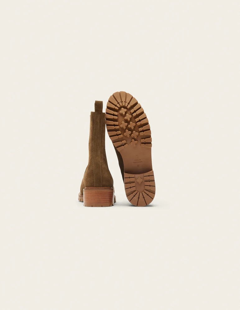 Découvrez Dorianne en suède kaki, bottine pour femme, elle est fabriquée en suède italien certifié LWG. La semelle intérieure et la doublure sont en cuir de chèvre. La semelle extérieure combine cuir et gomme, offrant une hauteur de 4 cm. Fabrication au Portugal avec une construction soudée.