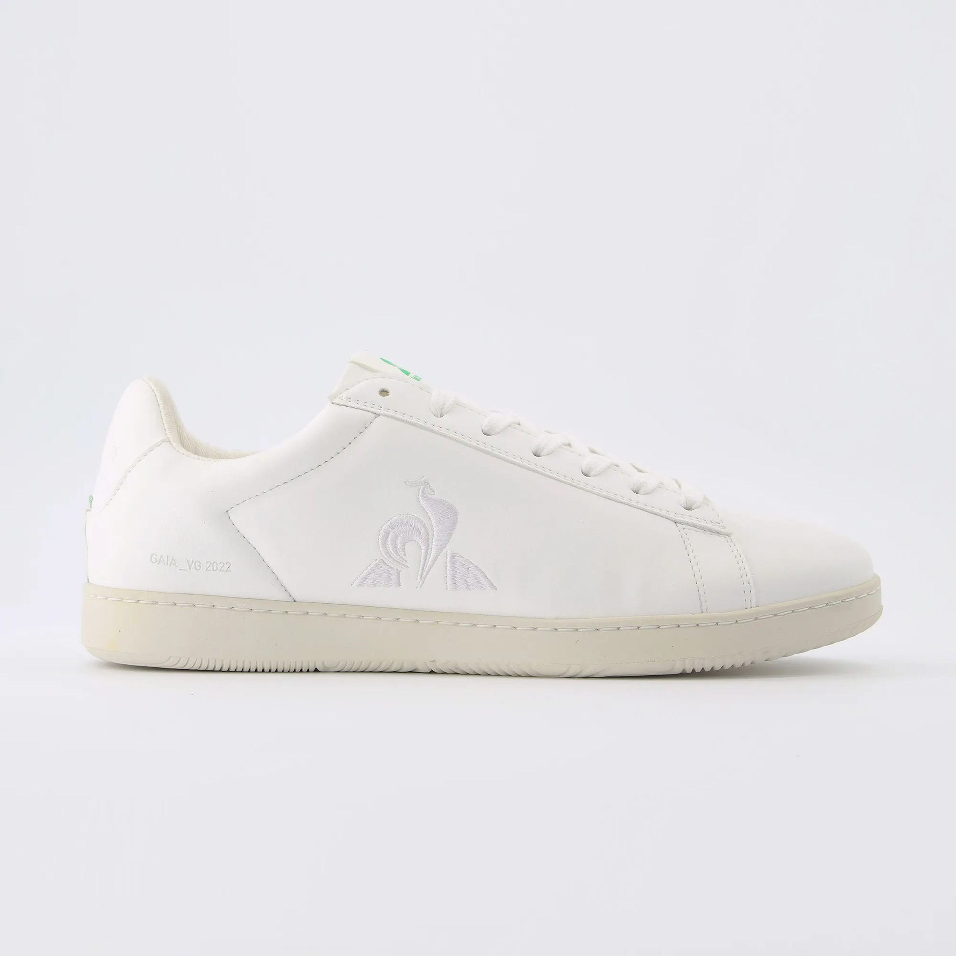Tige Matière naturelle à base de raisin Semelle intérieure et doublure en cotton bio Semelle extérieure caoutchouc Détails sur le côté droit sont mentionnés le nom du modèle et le millésime Un drapeau végétal blanc et vert vient habiller le talon des chaussures Le logo de la marque est brodé sur le côté extérieur de la chaussure."