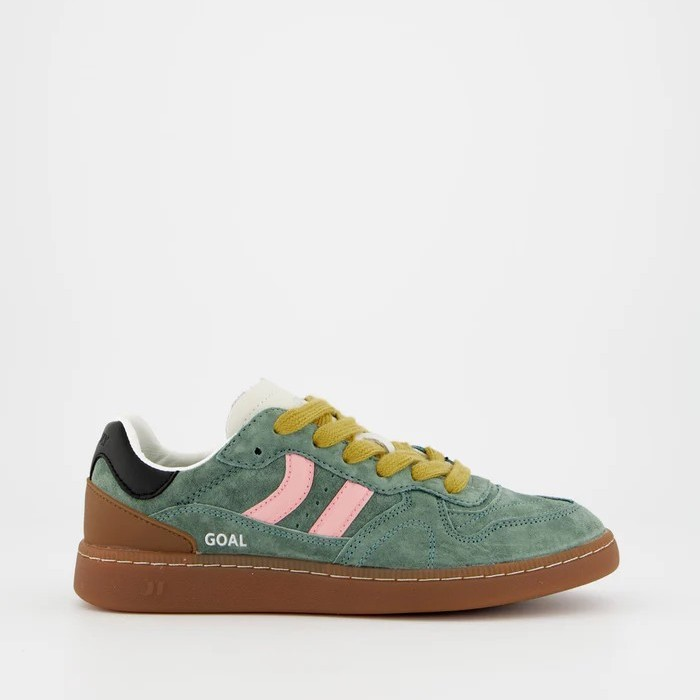 Chaussure de sport en daim avec détails de couleurs contrastées. Languette en cuir et préformée avec rembourrage figuré. Vues de la doublure en cuir. Lacets plats interchangeables en coton bicolore. Col légèrement rembourré. La partie avant est dotée d'un renfort de couture. Semelle flexible en caoutchouc/caoutchouc qui offre durabilité et adhérence. Il porte le nom du modèle « GOAL » sur le côté en vieil or.