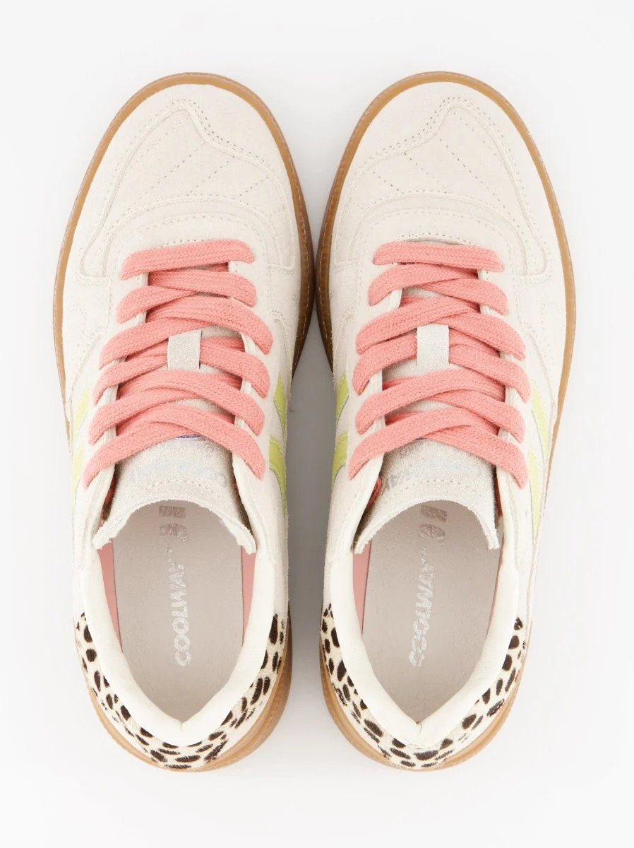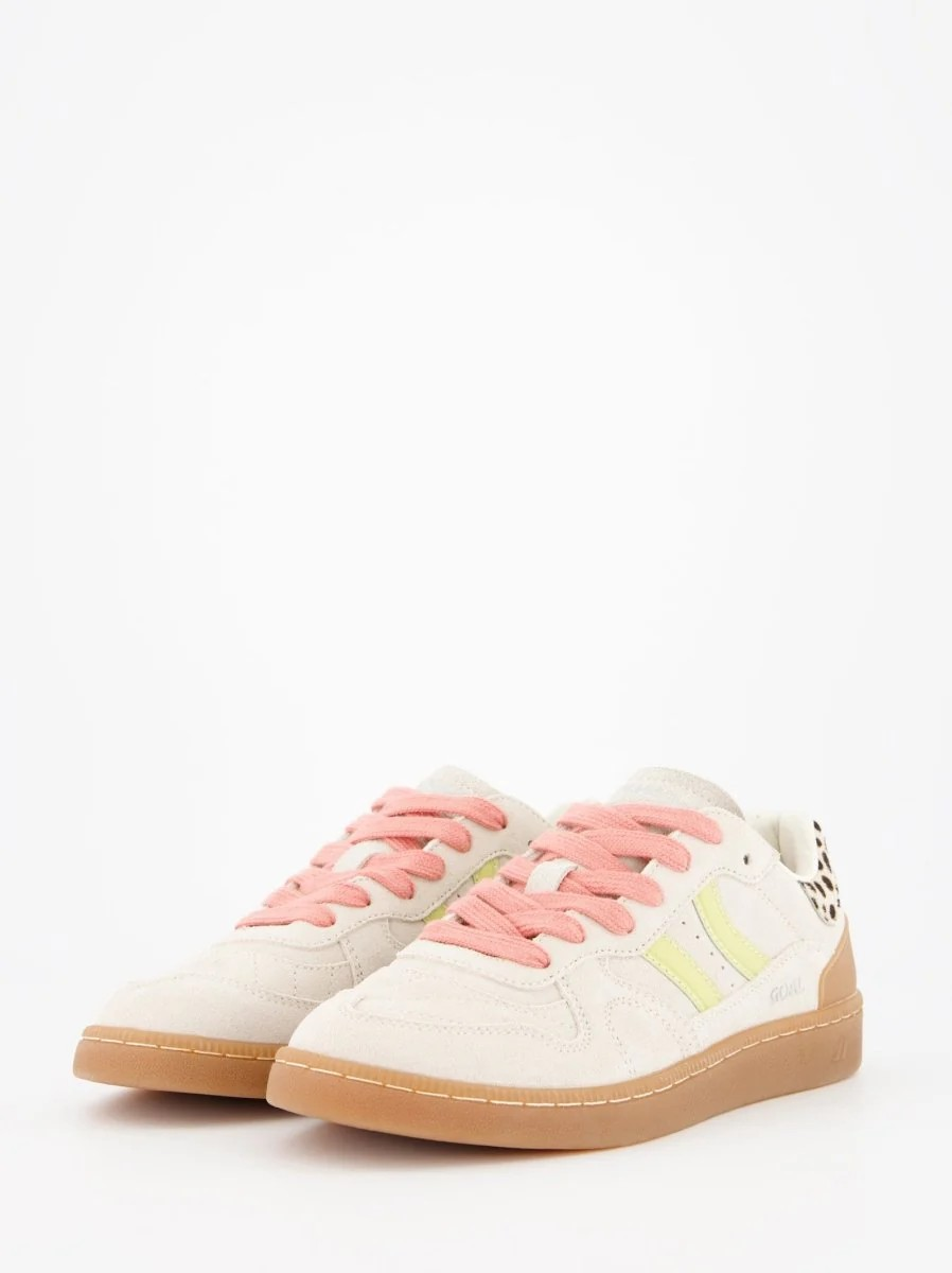 Chaussure de sport en daim avec détails de couleurs contrastées. Languette en cuir et préformée avec rembourrage figuré. Vues de la doublure en cuir. Lacets plats interchangeables en coton bicolore. Col légèrement rembourré. La partie avant est dotée d'un renfort de couture. Semelle flexible en caoutchouc/caoutchouc qui offre durabilité et adhérence. Il porte le nom du modèle « GOAL » sur le côté en vieil or.