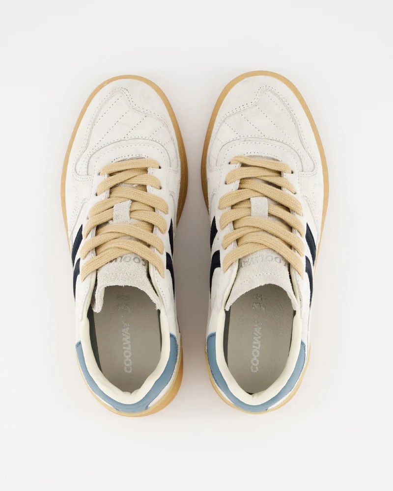 Chaussure de sport en daim avec détails de couleurs contrastées. Languette en cuir et préformée avec rembourrage figuré. Vues de la doublure en cuir. Lacets plats interchangeables en coton bicolore. Col légèrement rembourré. La partie avant est dotée d'un renfort de couture. Semelle flexible en caoutchouc/caoutchouc qui offre durabilité et adhérence. Il porte le nom du modèle « GOAL » sur le côté en vieil or.