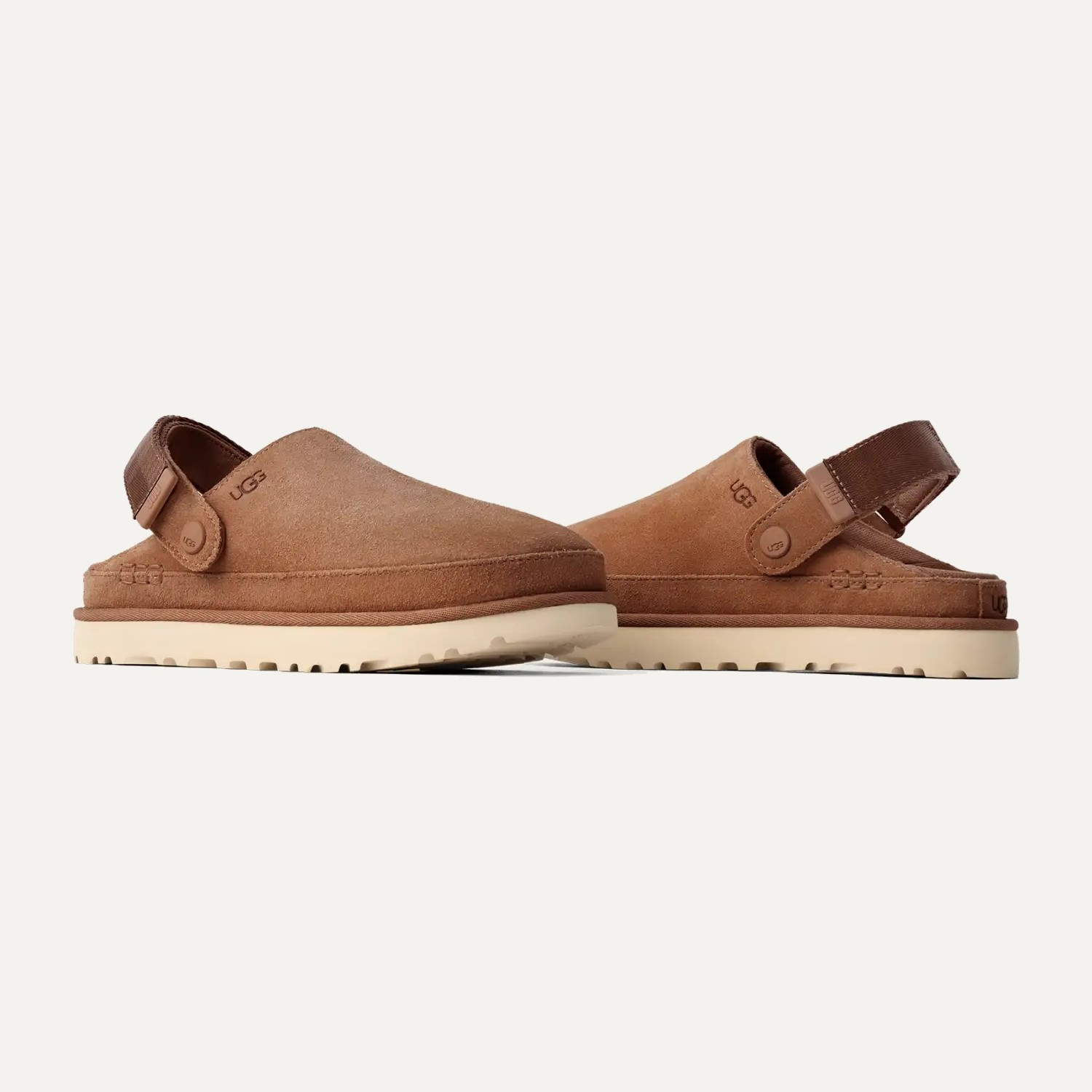 Confectionné en daim velouté, ce sabot à plateau polyvalent va avec tout. L’essence même d’un sabot, c’est son confort et en la matière, le sabot Goldenstar se montre à la hauteur ! Avec sa lanière pivotante, ce sabot se porte de deux façons, soit avec la lanière enserrant le talon, soit avec la lanière sur le dessus et le talon libre pour l’enfiler et le retirer rapidement. Une semelle extérieure ultralégère assure amorti et maintien tout au long de la journée. La semelle extérieure de ce produit est soit en EVA issu de la canne à sucre, un composé responsable utilisant de la mousse de canne à sucre qui nous permet de réduire la dépendance aux combustibles fossiles en remplaçant l’éthylène à base de pétrole, soit en Treadlite by UGG™.