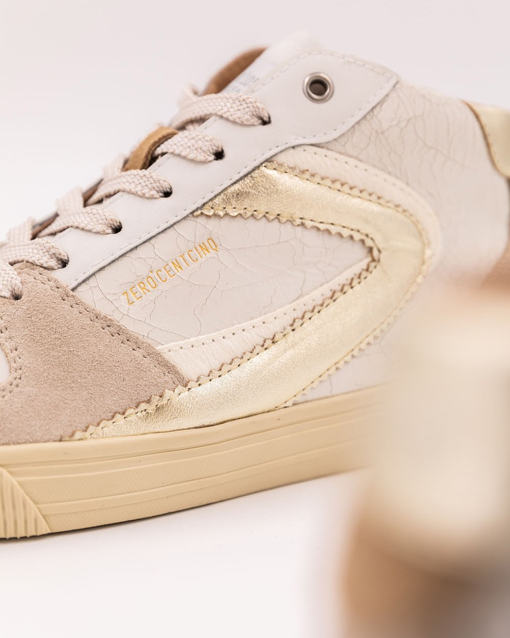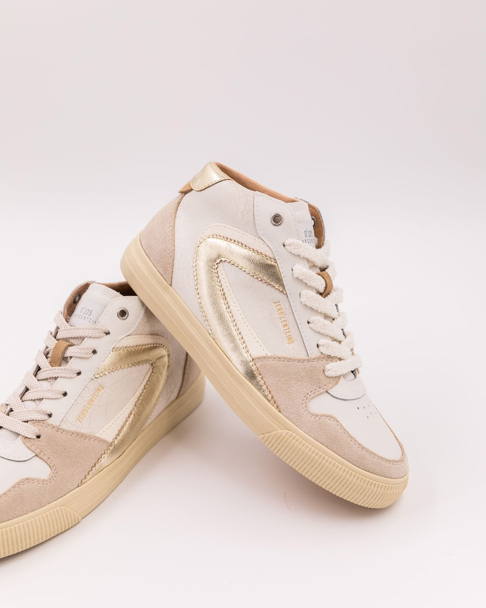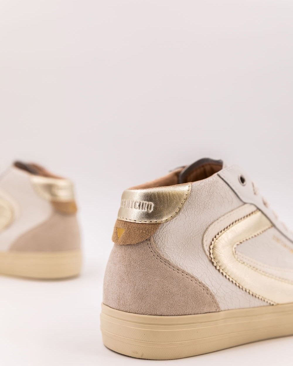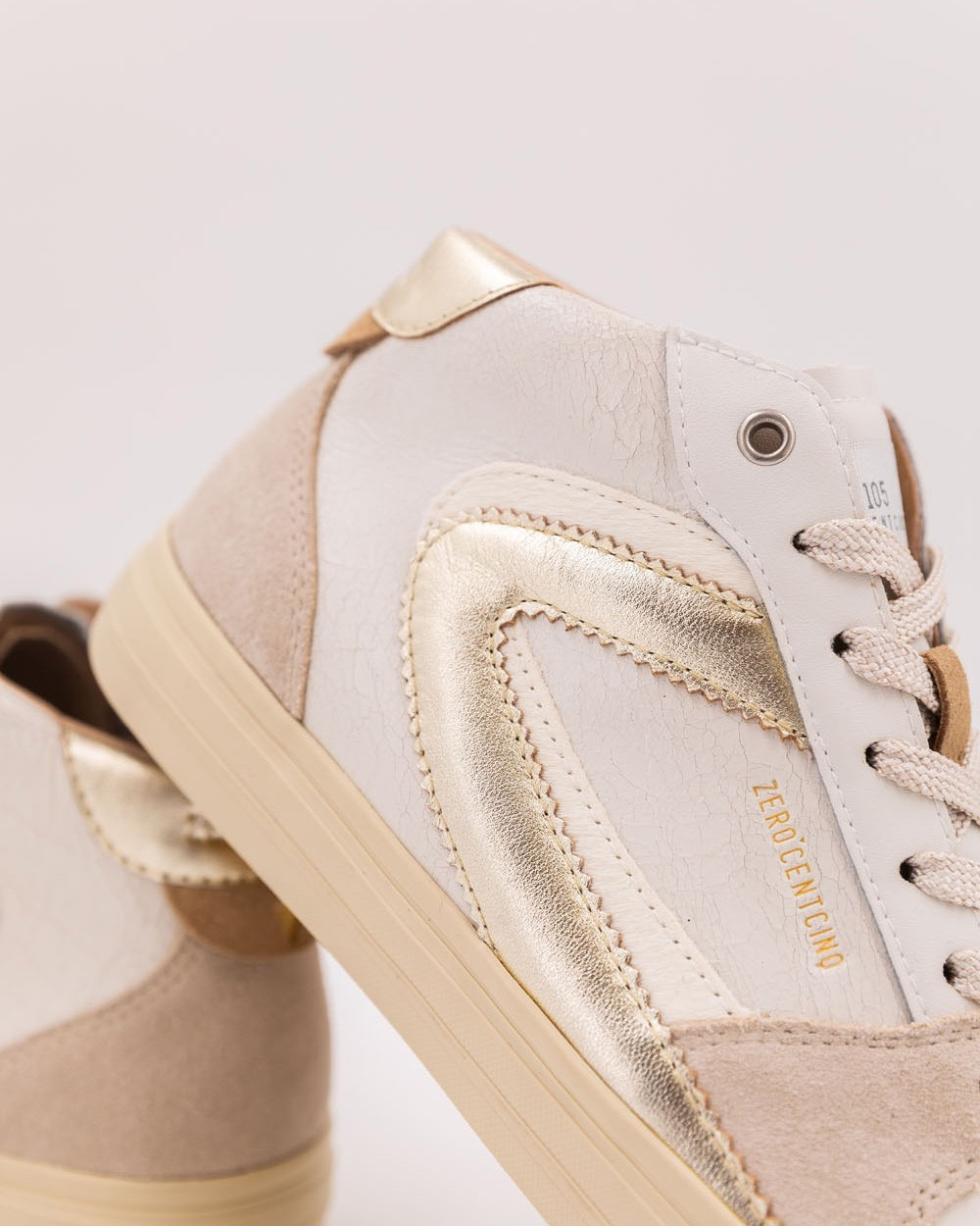 Cette basket montante est un modèle intemporel qui allie style et élégance. Sa base en cuir blanc craquelé lui confère une allure authentique tandis que les touches de cuir doré viennent subtilement illuminer la silhouette pour un look chic sans effort. Montante et confortable, cette sneaker est idéale pour celles qui souhaitent se démarquer tout en restant dans une esthétique épurée.