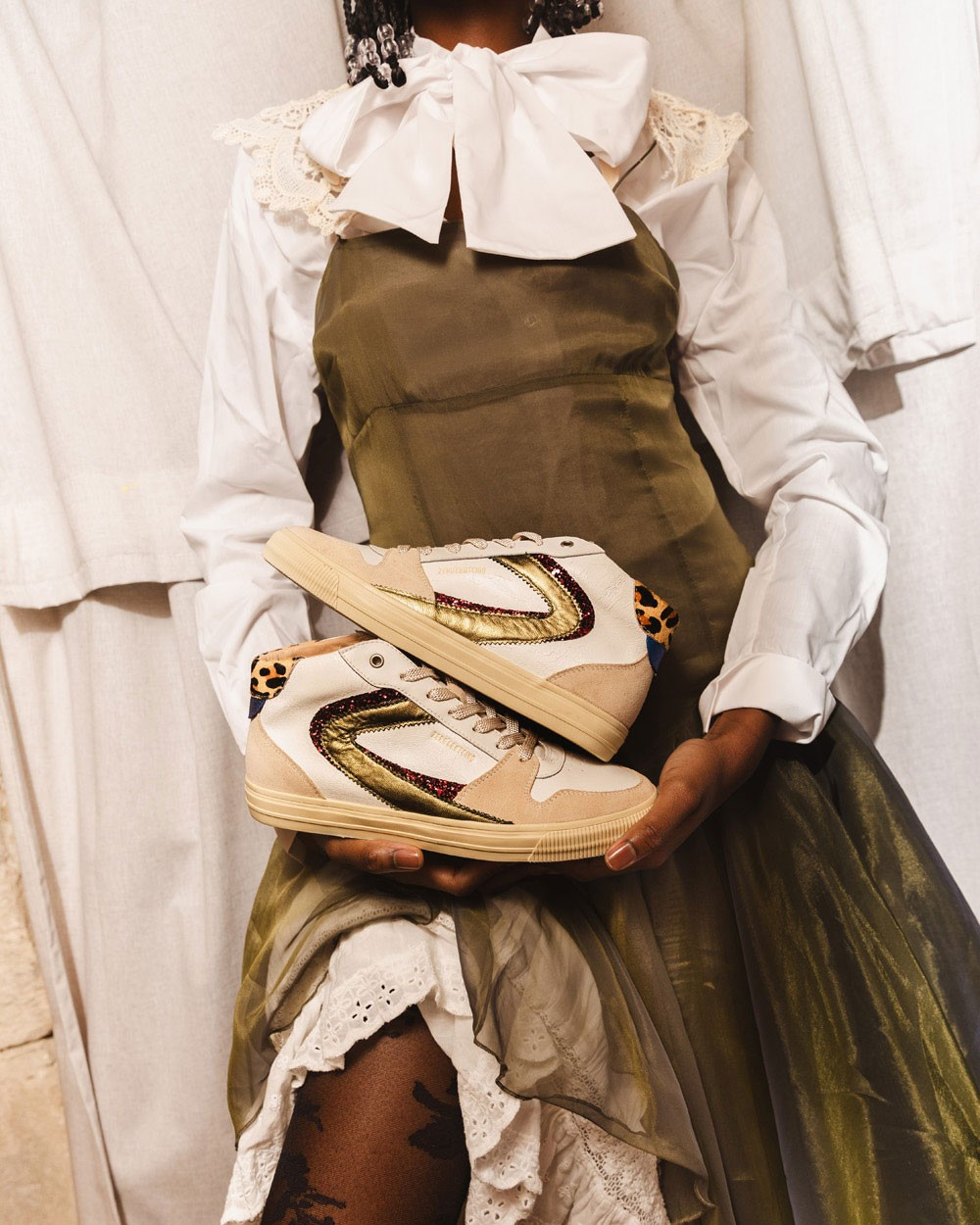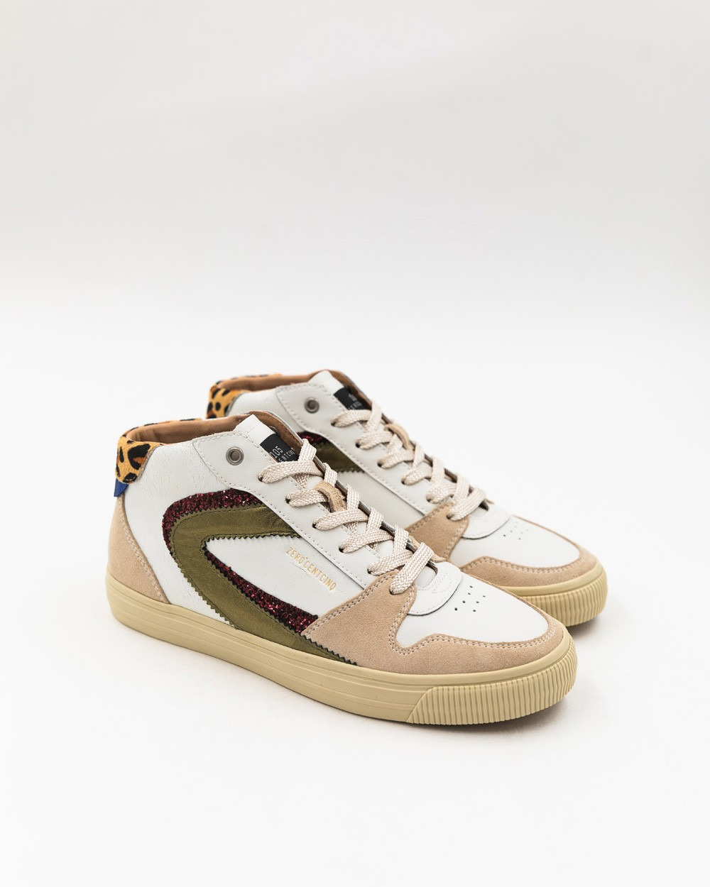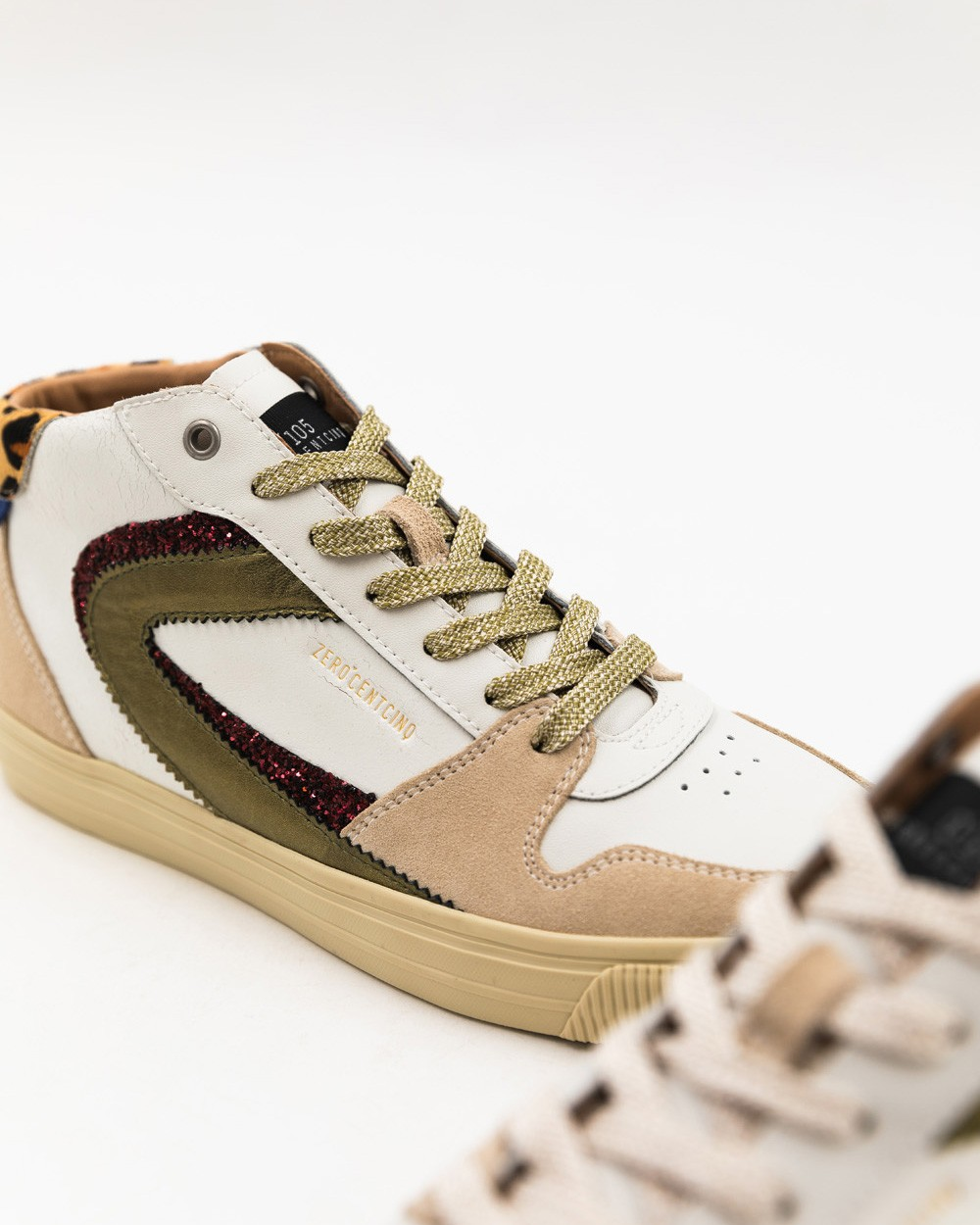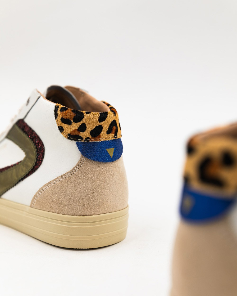 Le contraste saisissant entre le motif léopard et les paillettes rouges crée un look résolument tendance, idéal pour celles qui veulent sortir des sentiers battus. Le boomerang en cuir kaki confère une élégance intemporelle, subtilement relevée par la brillance audacieuse des paillettes.