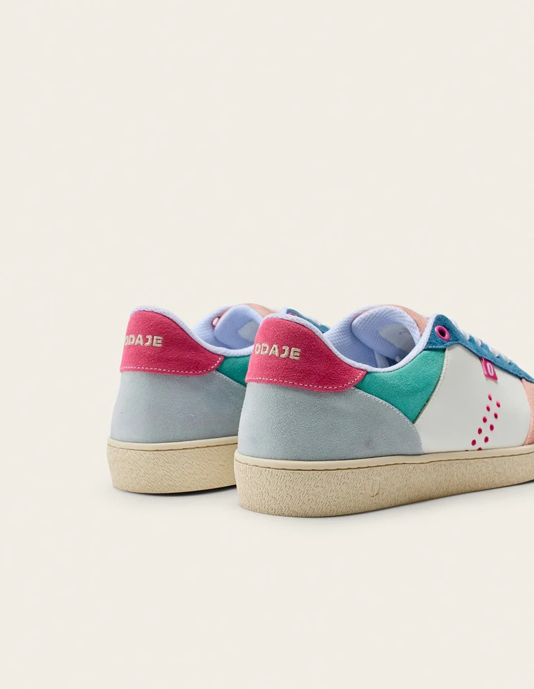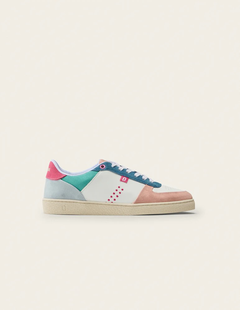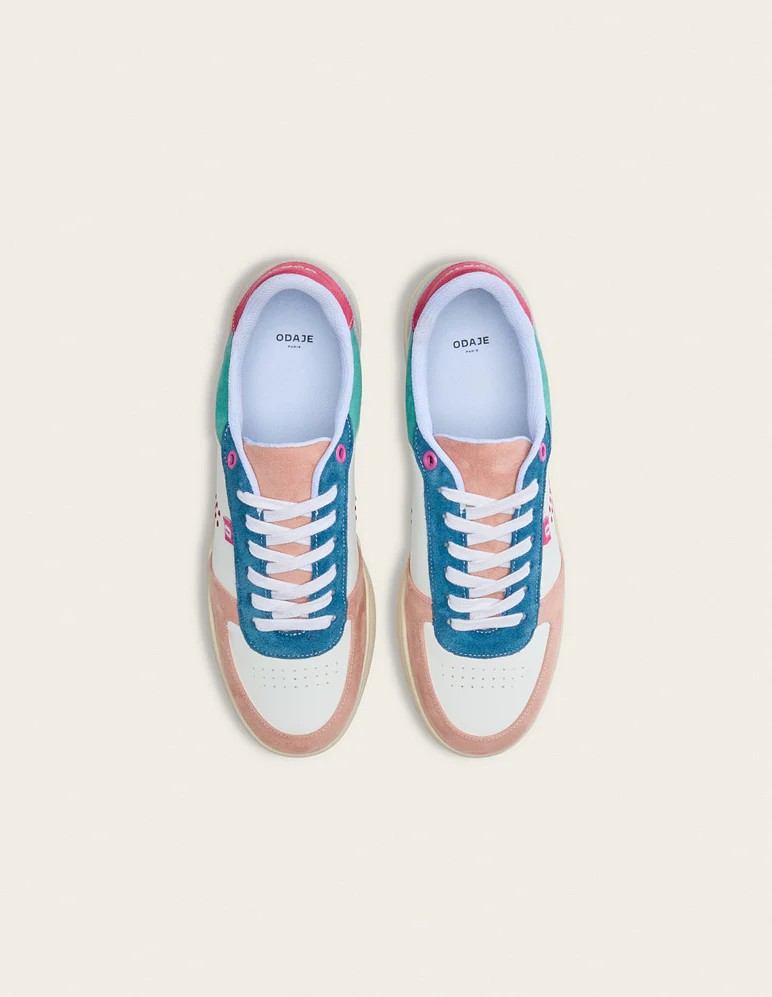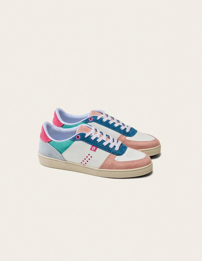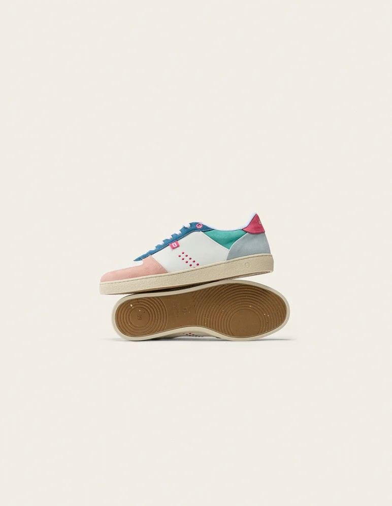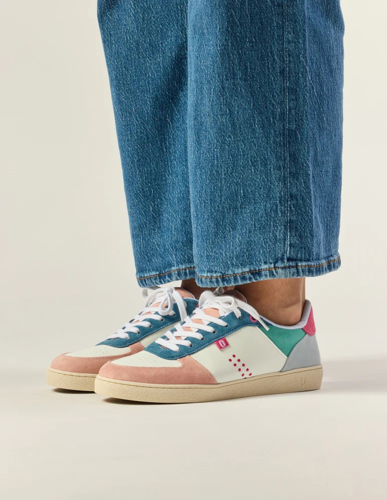 Découvrez Marie en vieux rose, blanc et pétrole. basket iconique pour femme, dessinée dans notre QG parisien, est composée de suède vegan,cuir recyclé et mesh, sourcée en Espagne et au Portugal. Sa doublure en mesh est rehaussée par une semelle intérieure également en mesh pour un confort optimal. Elle repose sur notre semelle récolte, fruit du recyclage de vos chaussures usagées. Eco-responsable et montée avec la technique traditionnelle du cousu Strobel, Marie promet souplesse à chaque pas. Coupure, Piqure et Montage au Portugal.