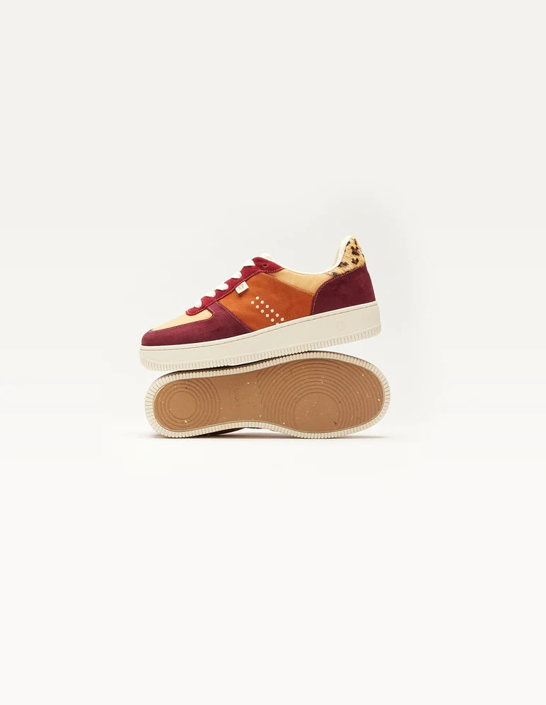 Maxence F en bordeaux et beige, notre basket basse pour femme. Conçue pour minimiser son impact carbone, Maxence F est fabriquée au Portugal à partir de suède vegan et suède d'origine espagnole et portugaise. Sa doublure et sa semelle intérieure sont en mesh. La semelle extérieure (re)colte est fabriquée à partir de chaussures et caoutchouc recyclés. Dotée d'une hauteur de semelle de 2,5 cm et d'une construction Strobel traditionnelle, cette paire est entièrement vegan et équipée de lacets en coton organique. Coupure, piqure et montage au Portugal