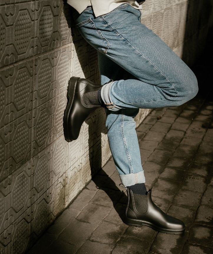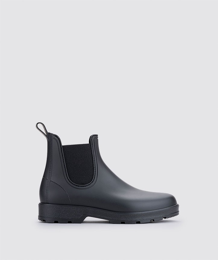Bottes de pluie pour homme, style piste, finition mate, côtés en textile, semelle intérieure amovible pour plus de confort.