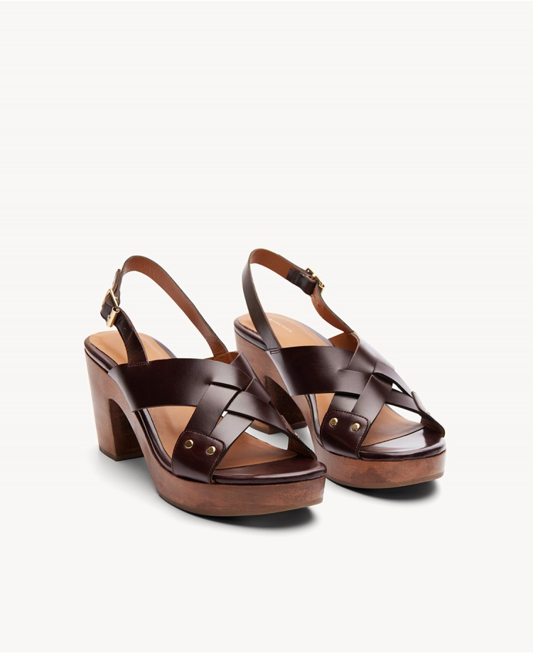 Ces nouvelles sandales « inspiration sabot » seront parfaites pour accompagner vos aventures cet été. Elles reposent sur une plateforme en bois stable et confortable et sont pourvues d’une semelle intérieure en cuir, rembourrée pour plus de confort. Les rivets en or mat apportent une petit touche brute et authentique.