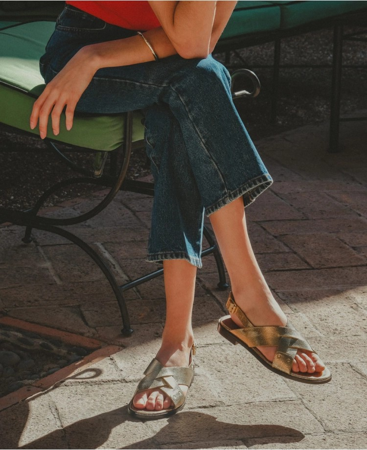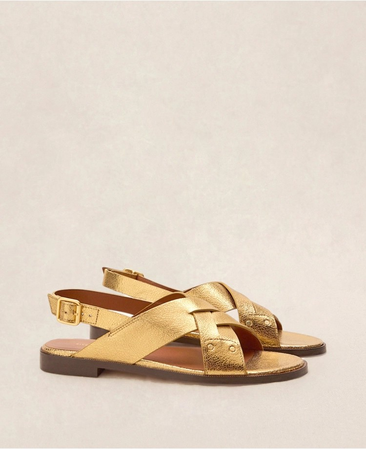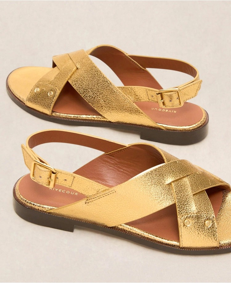 Confectionné en cuir d'agneau et en cuir de chèvre. Bout rond. Fermeture à l’aide d'une boucle à ardillon rectangle finition or vieilli. Doublure en cuir de chèvre et semelle en cuir à bords carrés. Tige en cuir d'agneau finition laminée craquelée provenant d'une tannerie espagnole. Fabriqué au Portugal dans le respect du savoir-faire traditionnel. Talon : 10 mm. Rivets ronds plats finition or vieilli. Brides croisées sur le cou-de-pied. Première de montage enrobée et ajout d'une mousse pour plus de confort.