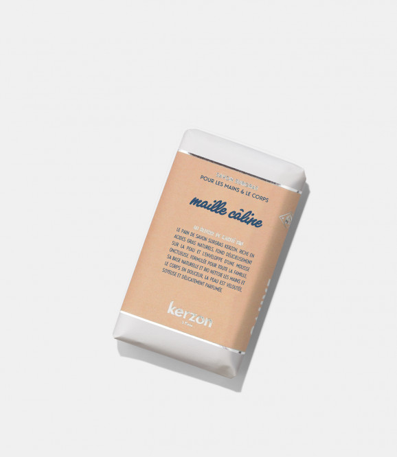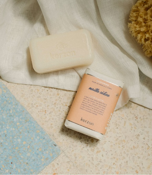 Le savon solide surgras Kerzon, riche en acides gras naturels et en beurre de karité bio, enveloppe la peau d’une mousse onctueuse et la parfume délicatement.