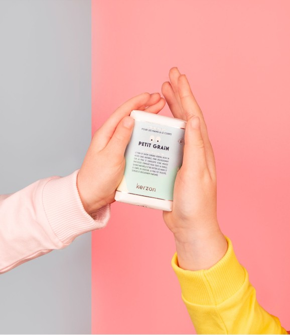 Le savon solide surgras Kerzon, riche en acides gras naturels, en beurre de karité et en huile d'amande douce bio, enveloppe la peau d’une mousse onctueuse et la parfume délicatement.