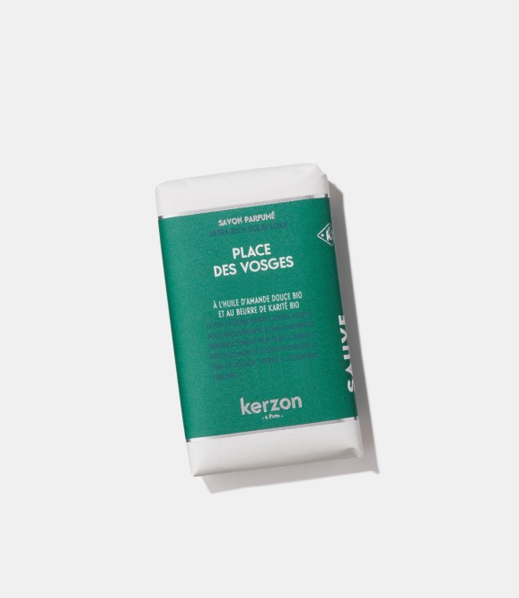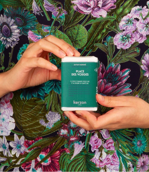 Le savon solide surgras Kerzon, riche en acides gras naturels, en beurre de karité et en huile d'amande douce bio, enveloppe la peau d’une mousse onctueuse et la parfume délicatement.