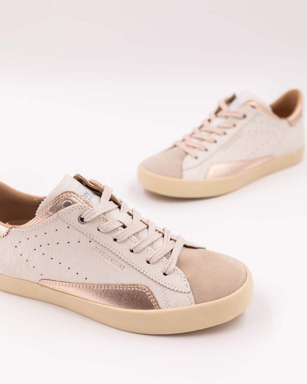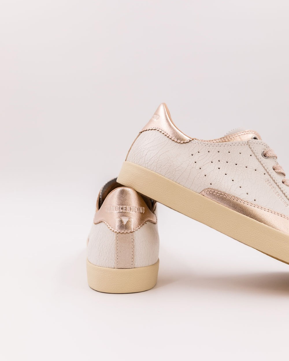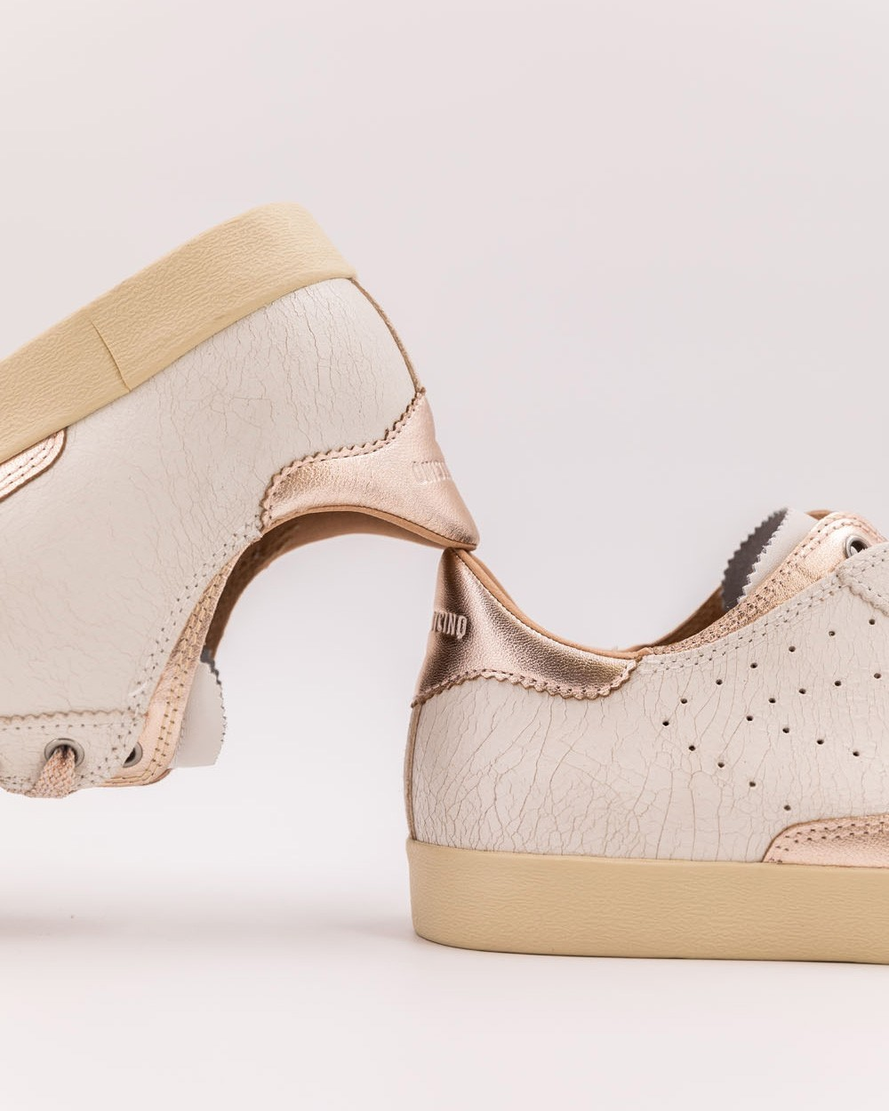 0-105 vous propose une version intemporelle de son modèle SC06. Des baskets qui incarnent l’équilibre parfait entre la simplicité et la délicatesse. Un cuir craquelé blanc, sublimé par des touches de rose gold métallique pour une paire élégante minimaliste. Portez-les avec une robe fluide ou une jupe en satin pour un look qui joue avec la délicatesse des textures.