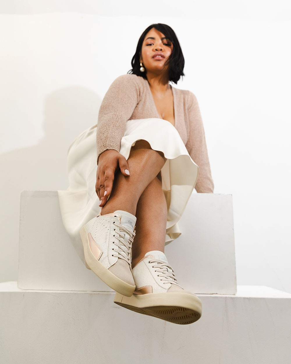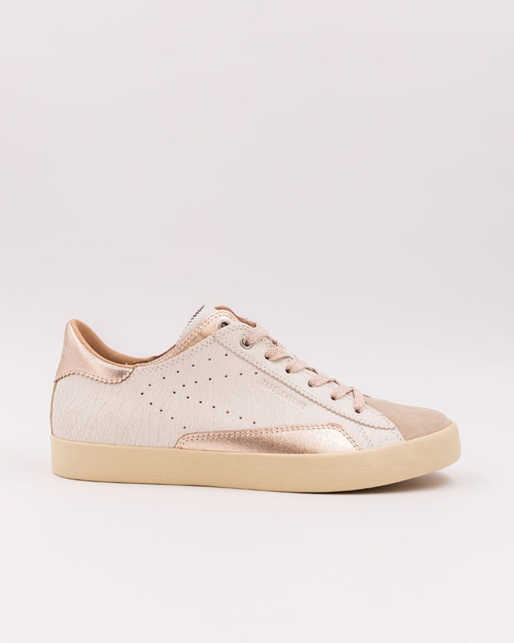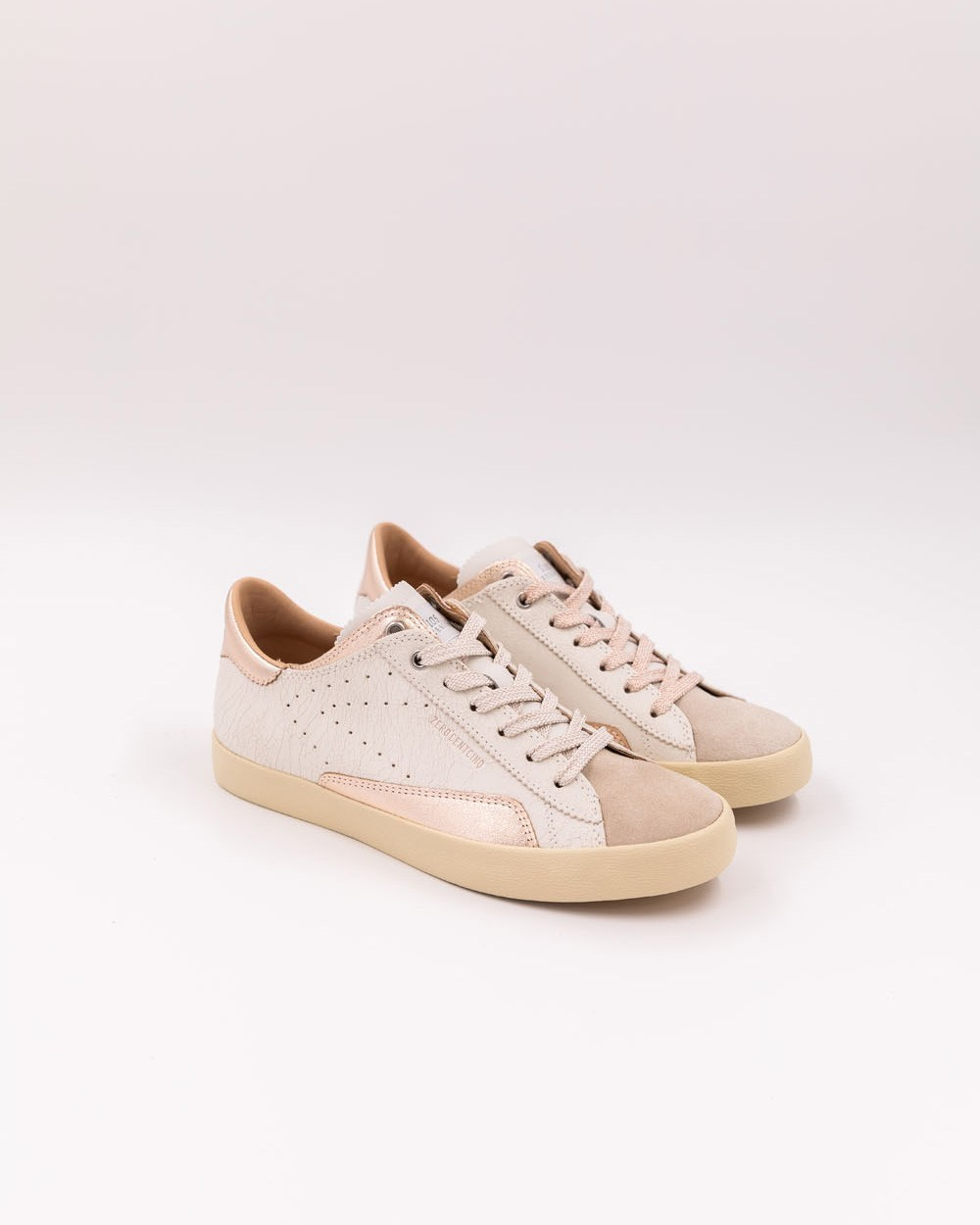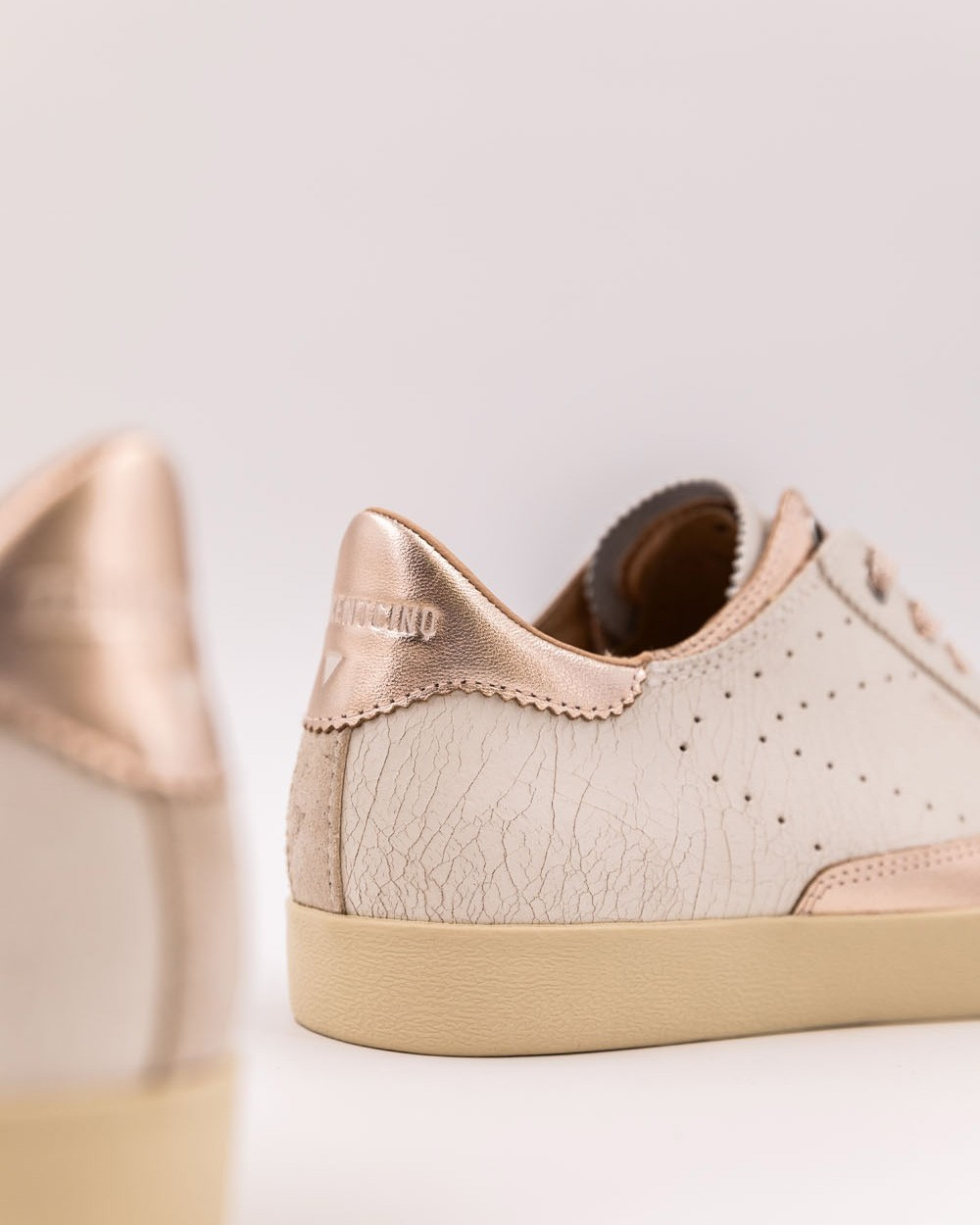 0-105 vous propose une version intemporelle de son modèle SC06. Des baskets qui incarnent l’équilibre parfait entre la simplicité et la délicatesse. Un cuir craquelé blanc, sublimé par des touches de rose gold métallique pour une paire élégante minimaliste. Portez-les avec une robe fluide ou une jupe en satin pour un look qui joue avec la délicatesse des textures.