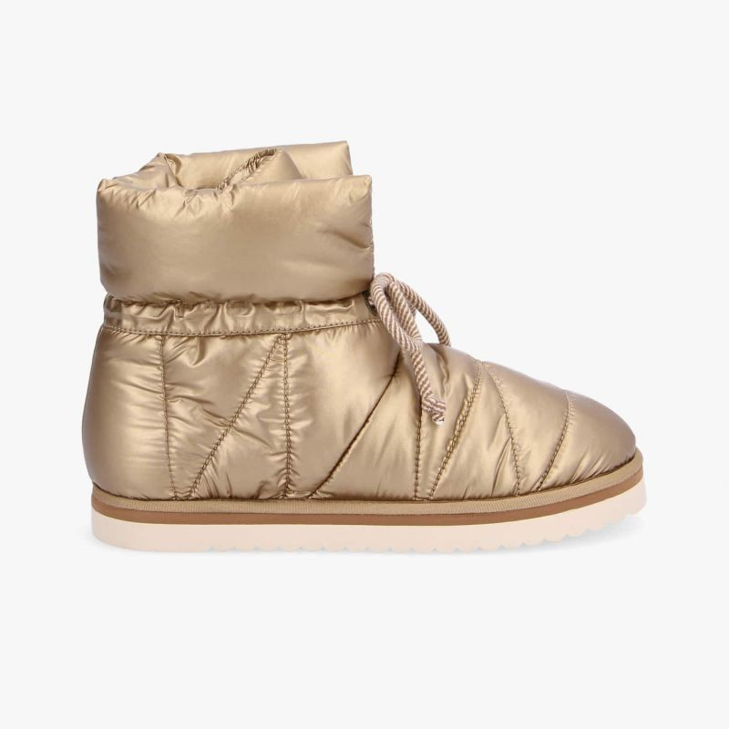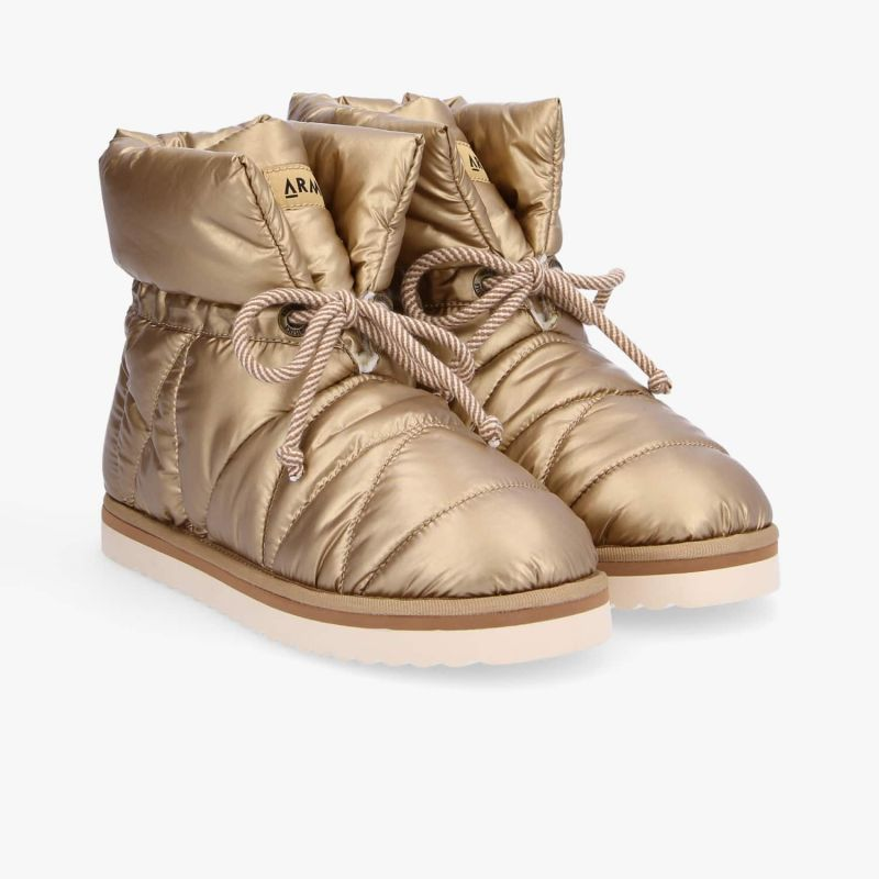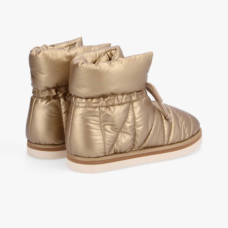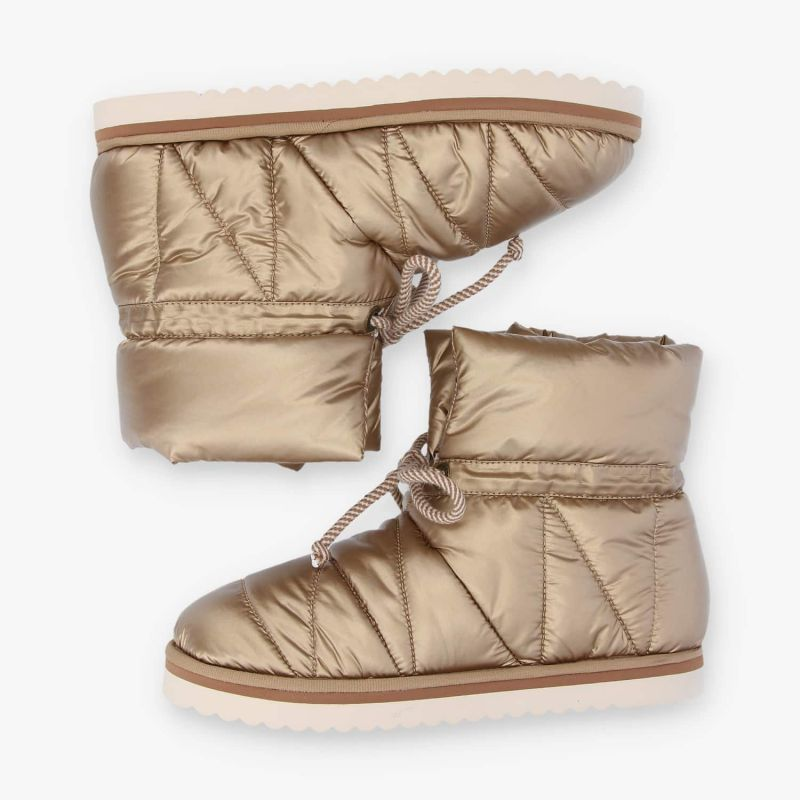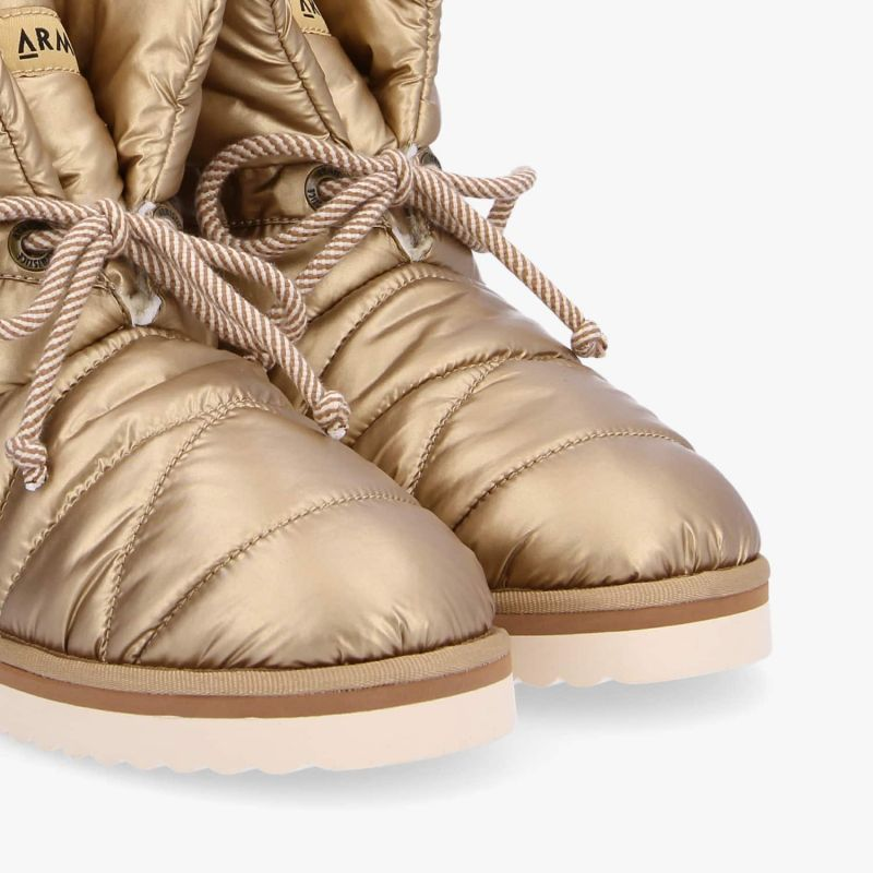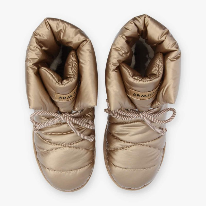 Direction la lune avec cette version dorée du Slow Mid ! Armistice imagine ici une bottine en toile matelassé doré, à la doublure chaude style moumoute pour nos envies de cocooning. Les codes de la marque ne sont pas oubliés, avec un lacet en corde bicolore passé dans un oeillet en métal vieilli, ainsi qu'une étiquette logo sur la languette. Ce boots pour femme est assemblée sur une semelle en caoutchouc blanche bordée d'un biais doré.